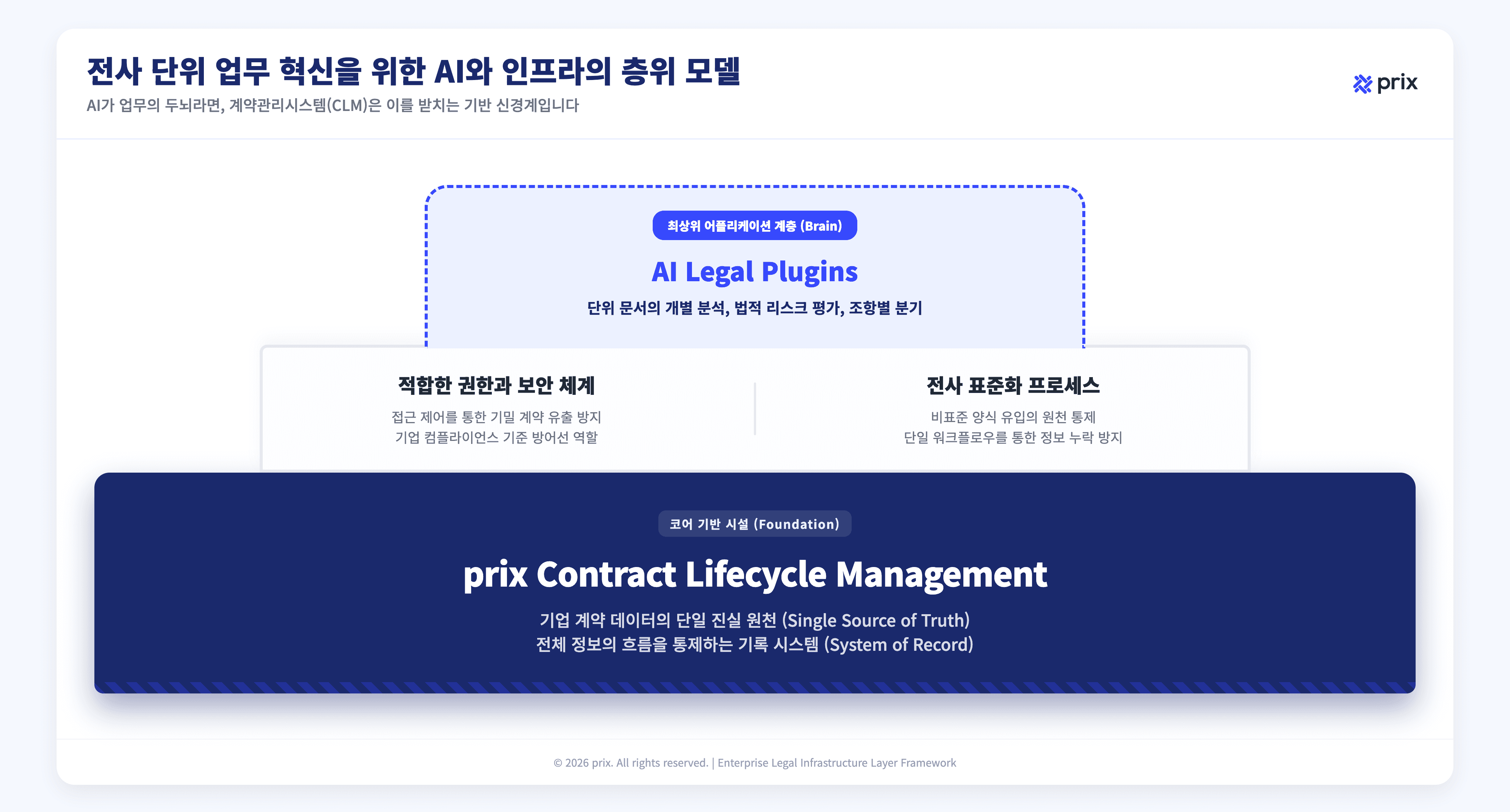 모든 계약서가 어디에 있는지, 어떤 조건으로 체결되었는지, 누가 승인했는지, 이행 상태는 어떤지 - 이 모든 것의 단일 진실 원천(Single Source of Truth)이 되는 것이 CLM의 역할입니다. 이것은 AI가 대체하는 영역이 아닙니다. AI가 제대로 작동하기 위해 반드시 필요한 인프라입니다.