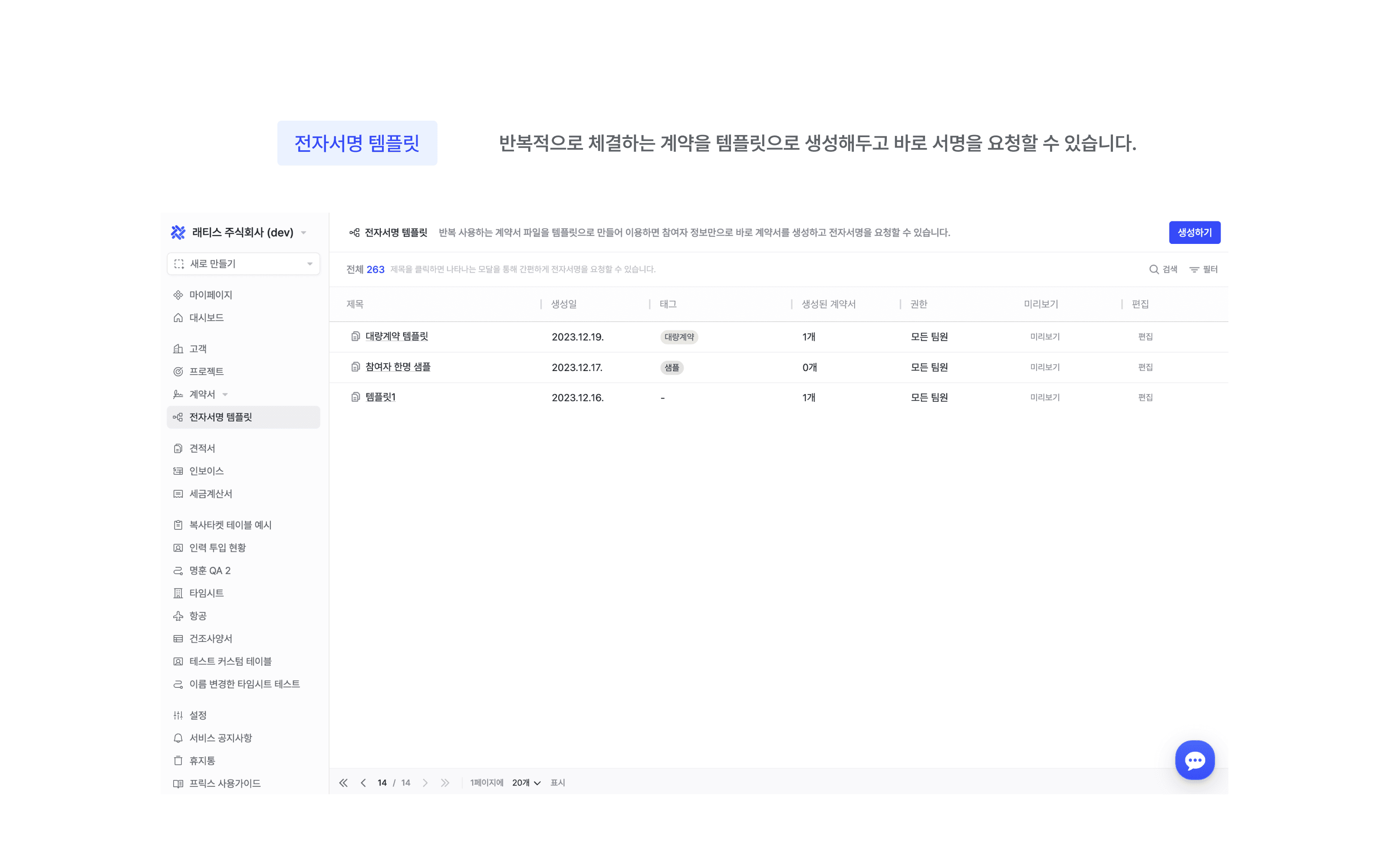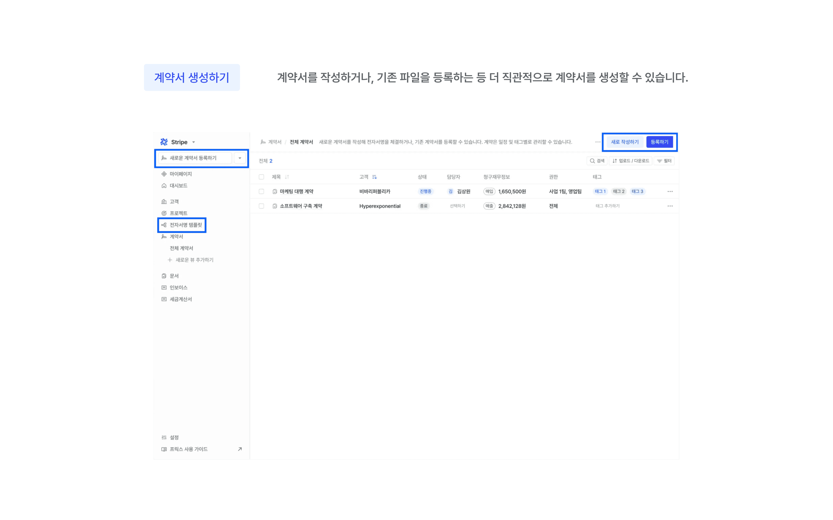 이제 계약서 작성, 계약서 등록, 전자서명 템플릿이 각각의 목적에 맞게 구분되어,