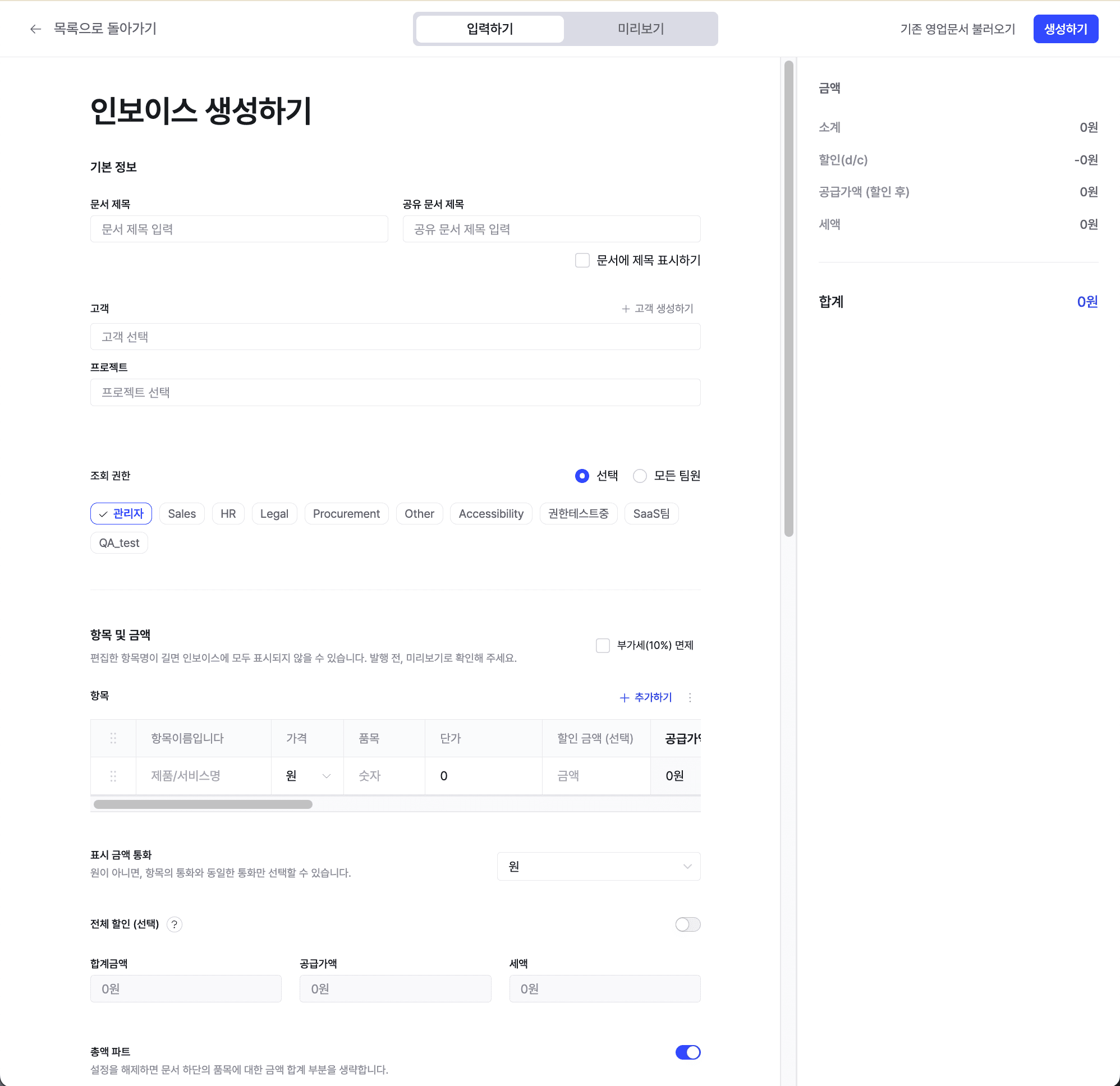 문서 항목을 엑셀처럼 쉽게 작성하고, 금액은 자동 계산됩니다