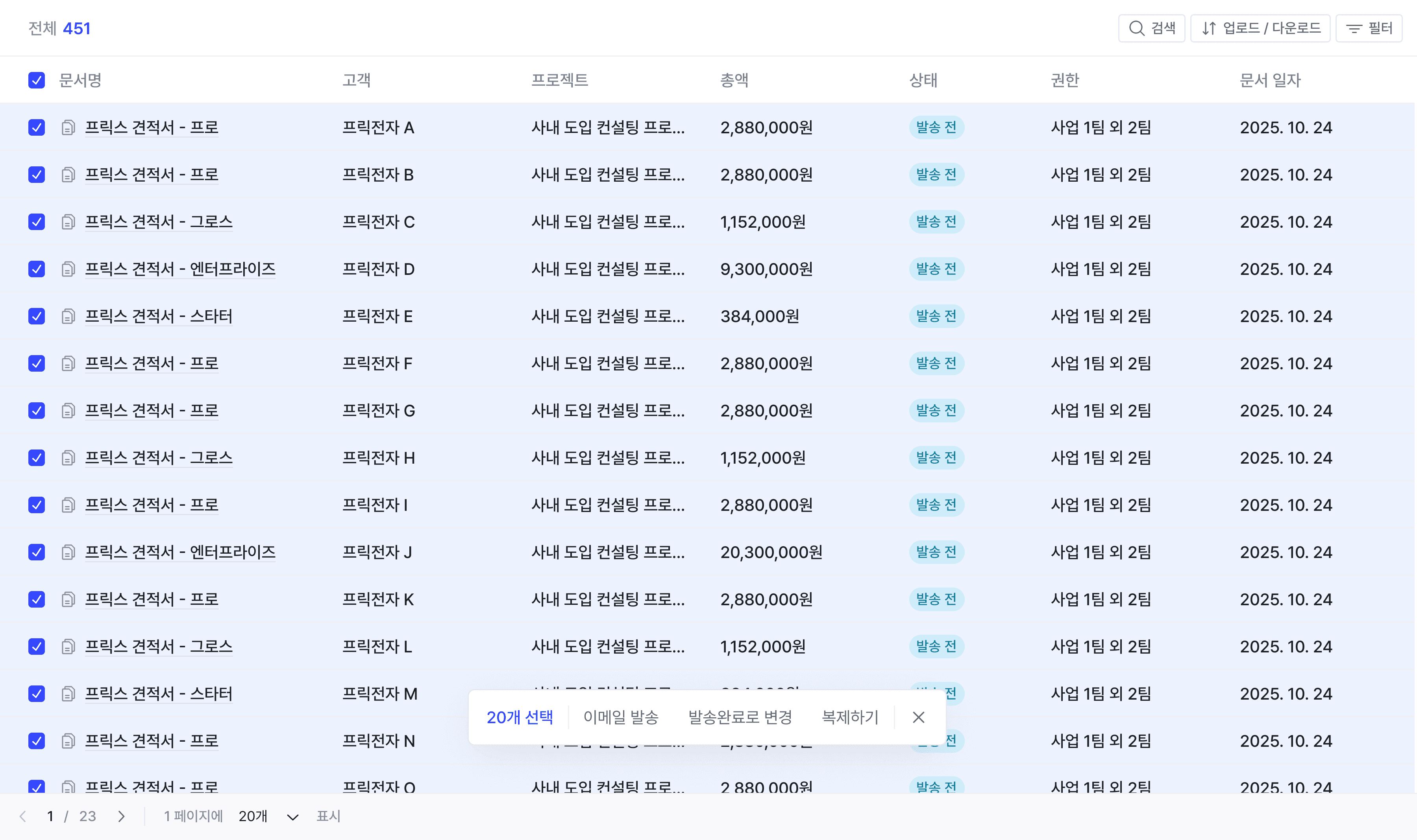 수많은 고객사와의 거래도 일괄 발송으로 깔끔하게 관리할 수 있습니다.