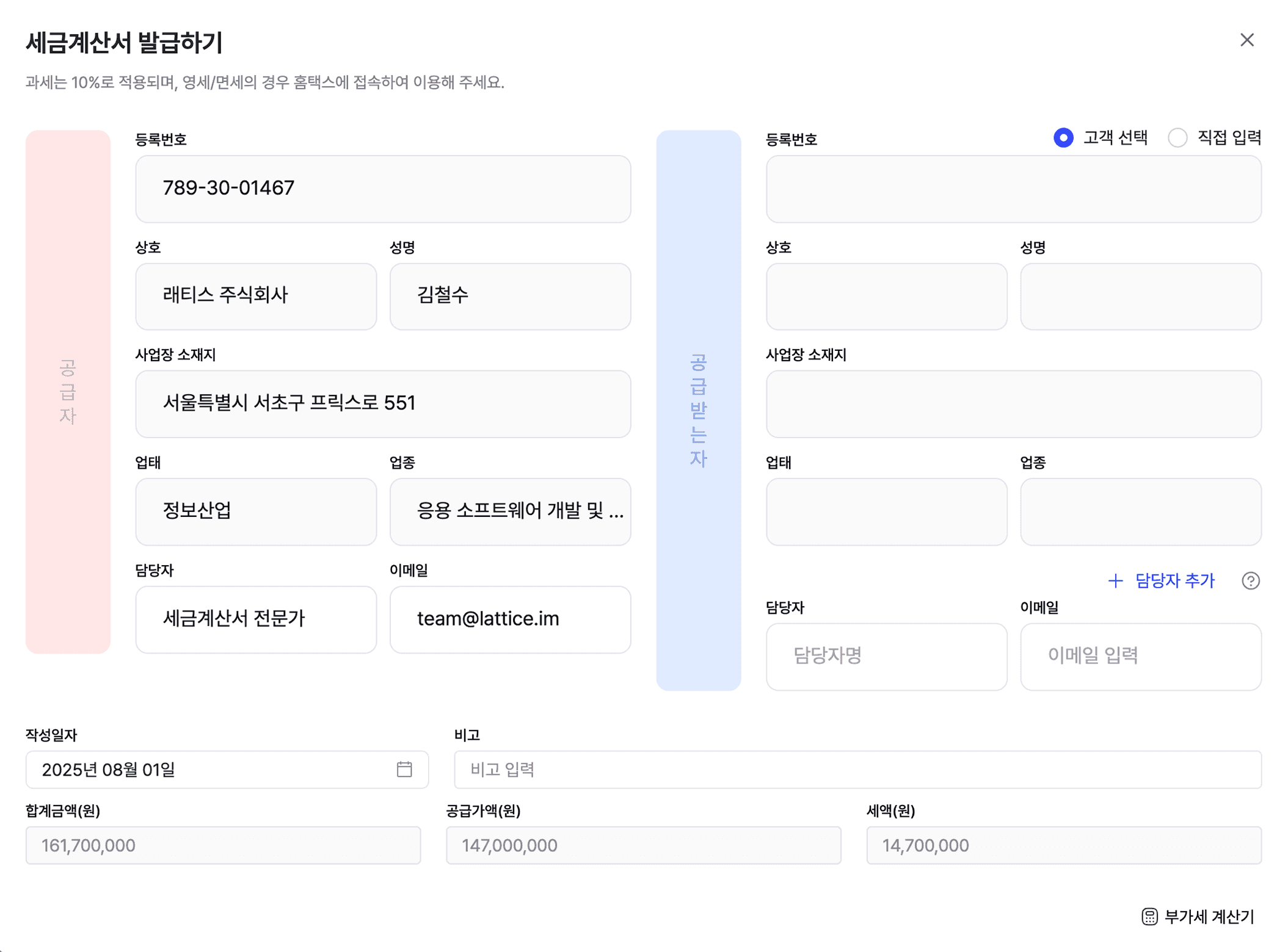 공동인증서를 연동하면 프릭스 내에서 세금계산서를 직접 발급할 수 있습니다.